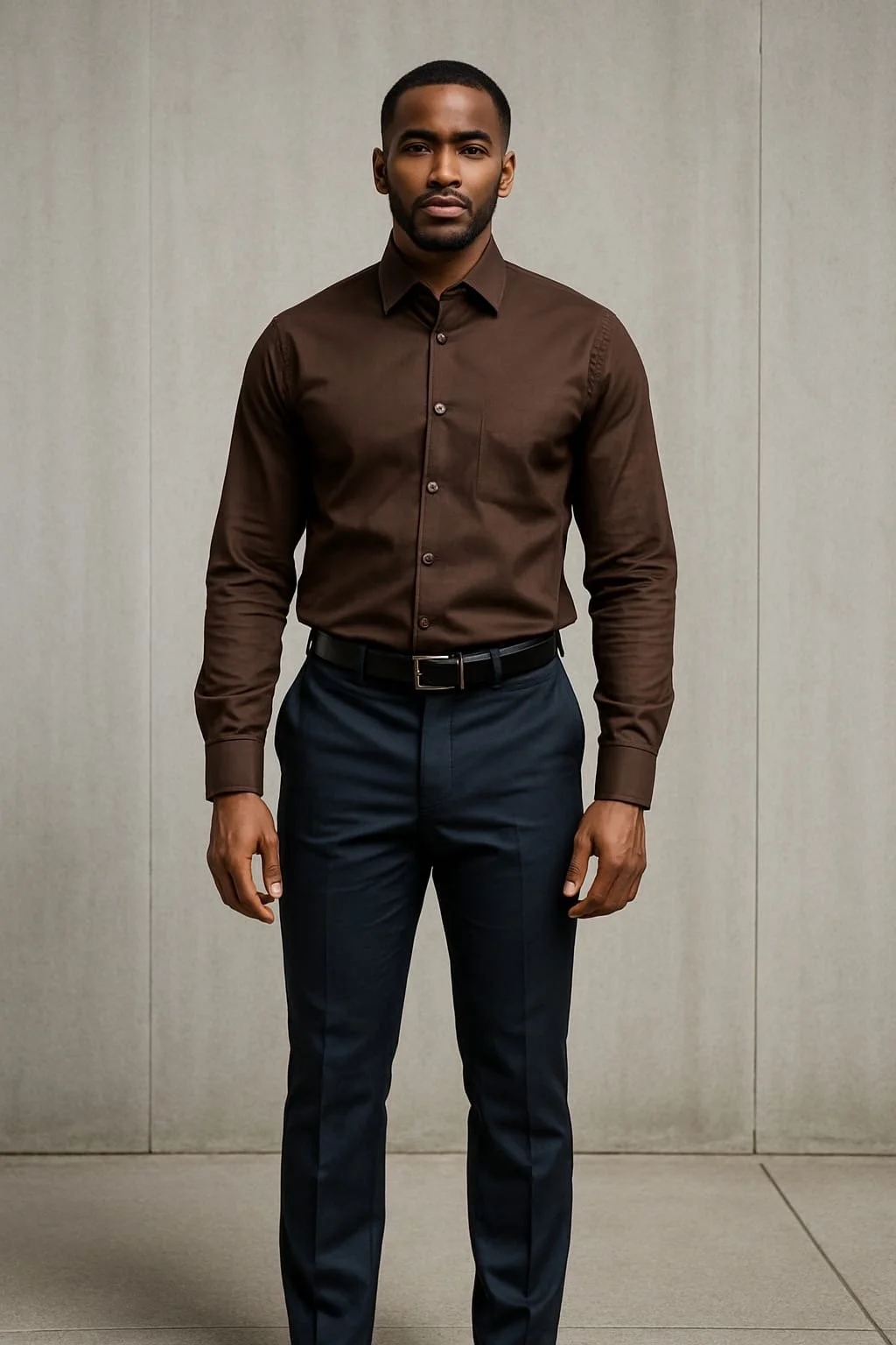 Elevate your professional wardrobe with this sophisticated dark gray dress shirt from Ferjul. Meticulously crafted with a traditional point collar and elegant French cuffs, this shirt exemplifies refined style and attention to detail. The regular fit design offers comfortable wear while maintaining a polished silhouette suitable for business and formal occasions. Constructed from a premium cotton blend fabric, the shirt features a convenient left chest pocket, button-down closure, and a straight bottom hem for a classic look. The long sleeves and standard dress shirt length ensure proper tucking and professional presentation throughout your day. Easy maintenance is assured with machine washable care instructions - simply tumble dry on low to maintain its crisp appearance. The versatile design makes it an excellent choice for business meetings, formal events, or any occasion requiring sophisticated attire. The shirt's solid dark gray color and clean-lined back design create a timeless aesthetic that pairs perfectly with suits or dress slacks.